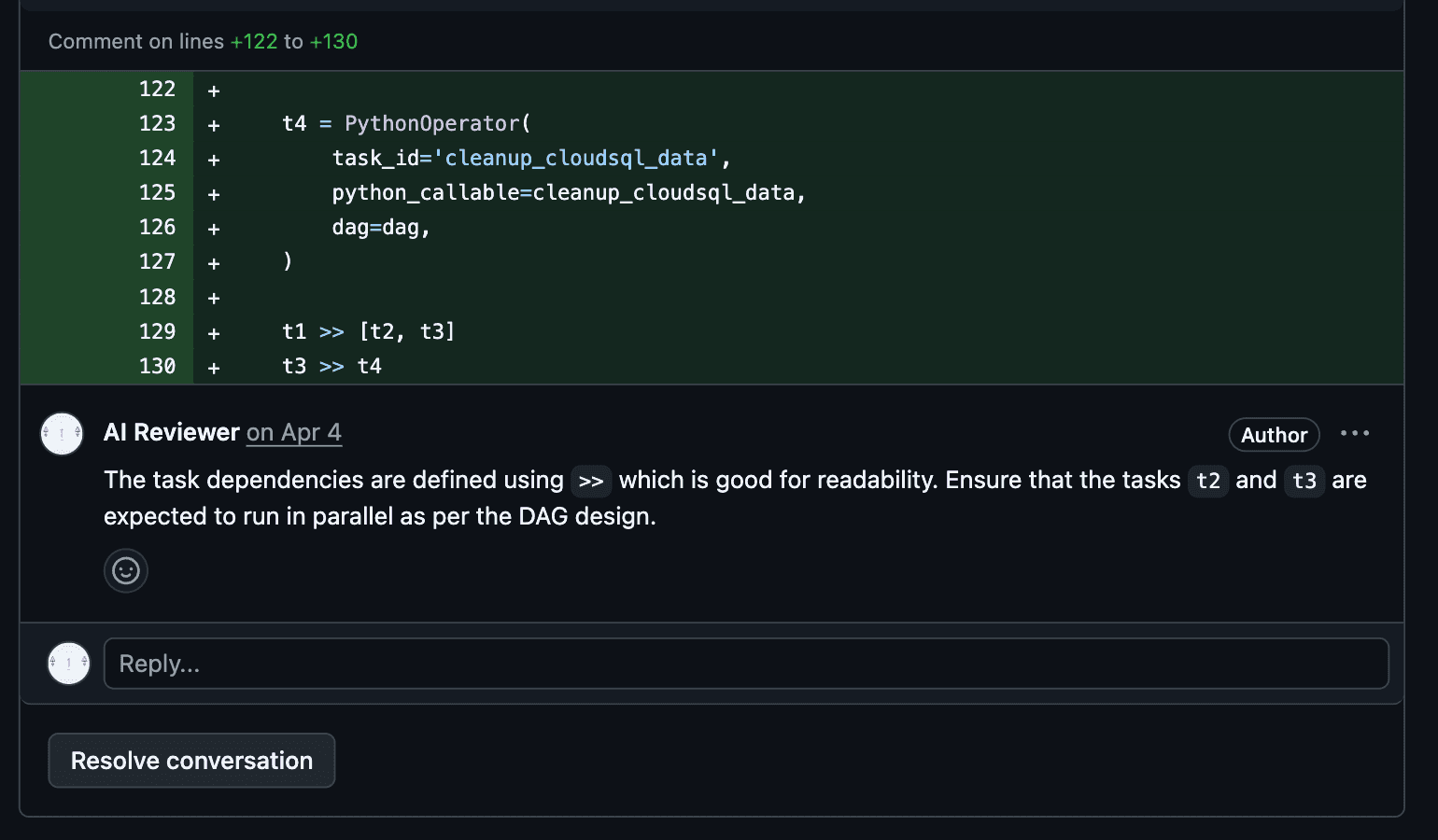 - **Inline Comments**: The AI will add comments directly on the code in the diff.